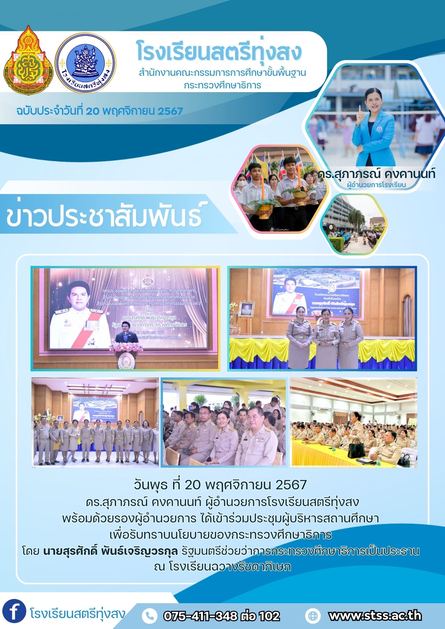 ดร.สุภาภรณ์ คงคานนท์ ผู้อำนวยการโรงเรียนสตรีทุ่งสงพร้อมด้วยรองผู้อำนวยการ ได้เข้าร่วมประชุมผู้บริหารสถานศึกษา เพื่อรับทราบนโยบายของกระทรวงศึกษาธิการ โดย นายสุรศักดิ์ พันธ์เจริญวรกุล รัฐมนตรีช่วยว่าการกระทรวงศึกษาธิการเป็นประธาน ณ โรงเรียนฉวางรัชดาภิเษก